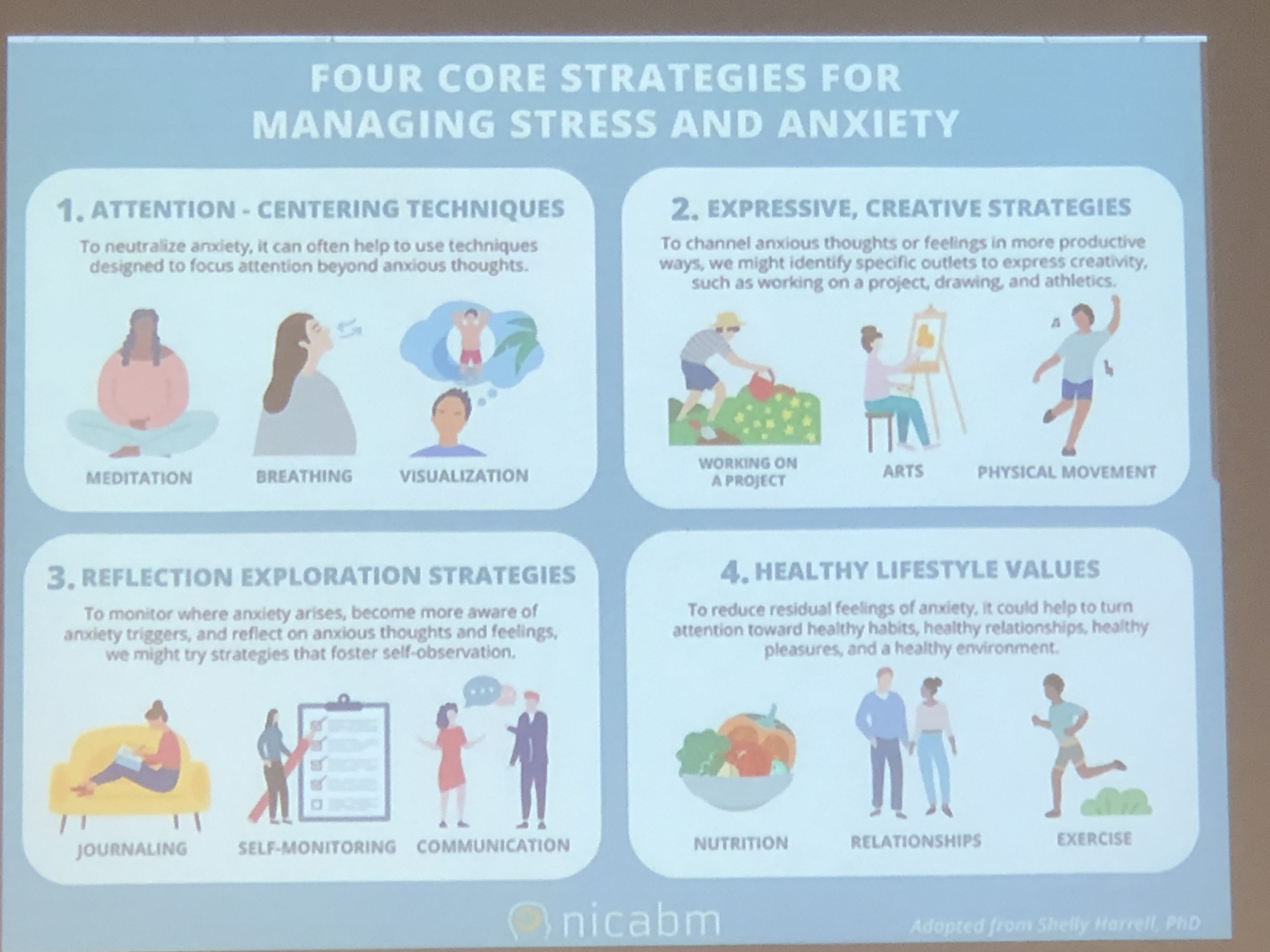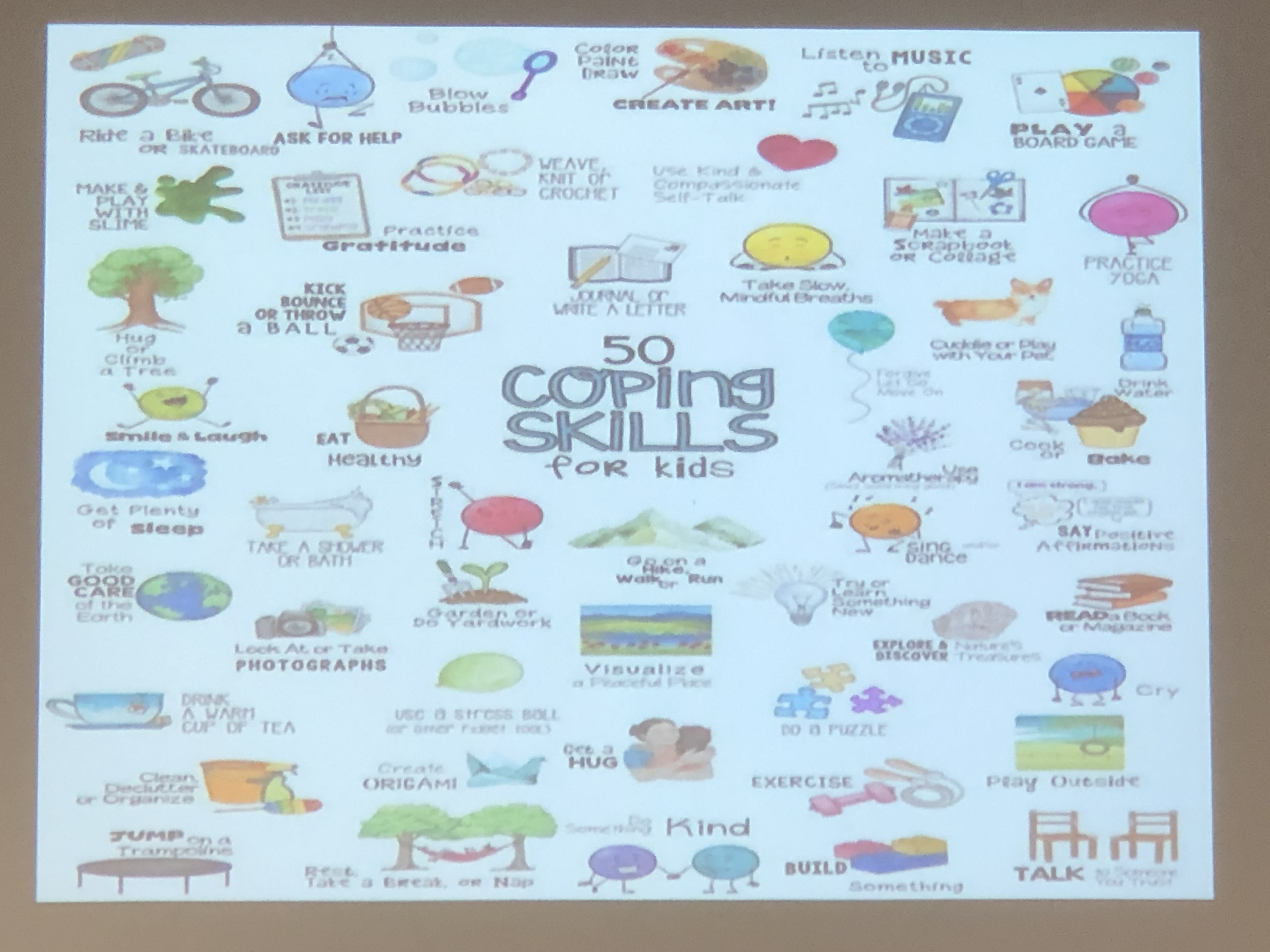 :呼吸、數數、自願幫忙跑腿、把自己棉被包起來、推牆壁、伸展身體、拳擊沙包、想像一個可以冷靜下來的地方、設計一些密碼跟信號、做簡單運動(伏地挺身、跑步)