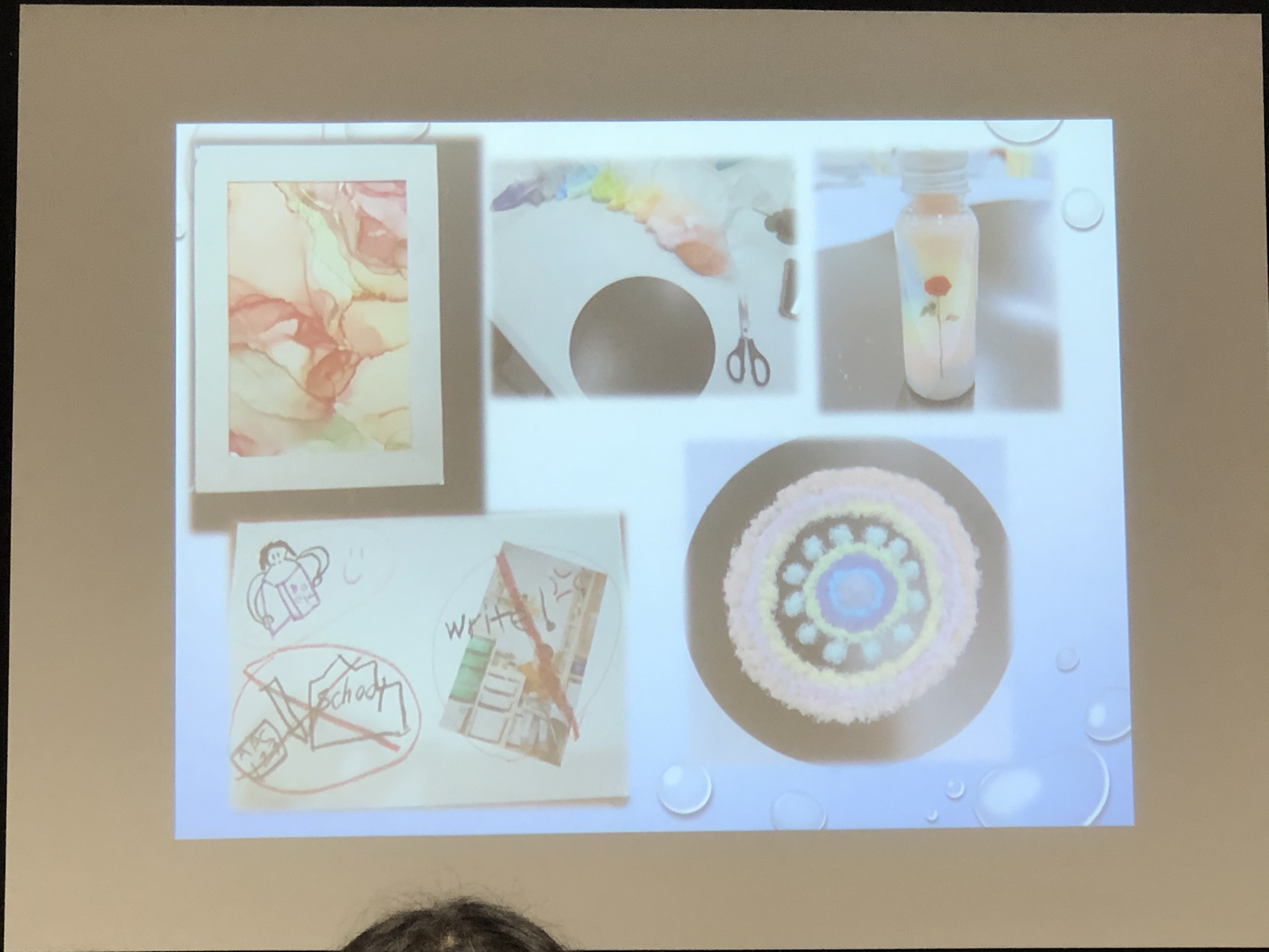 媒材:酒精墨水的流動畫,和諧粉彩、彩色鹽罐、彈性布(讓球滾到指定地方、躺在上面把她包起來)、氣球傘、黏土、玉米粉加水加顏料(觸感很有趣)