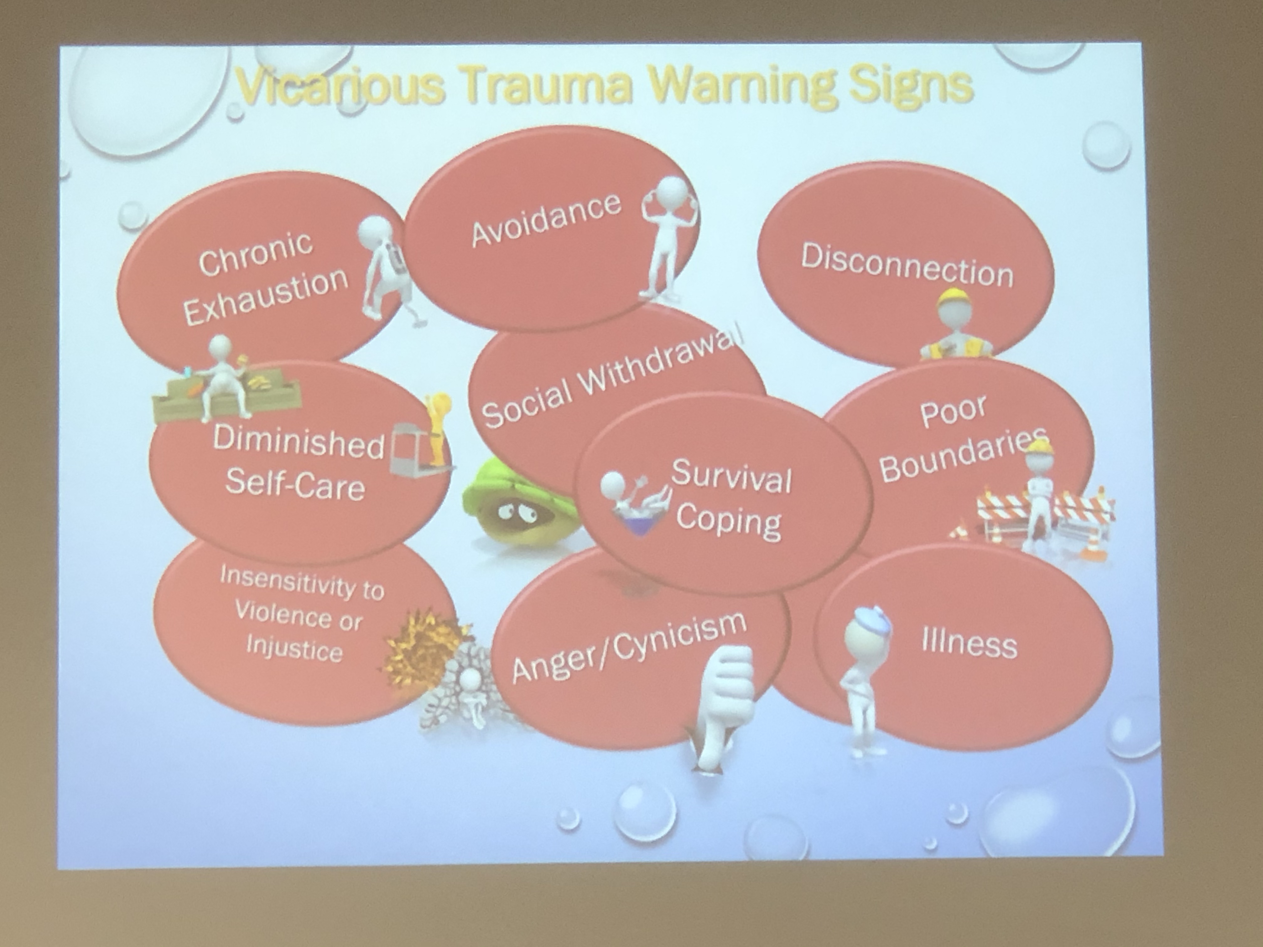 A:如果是替代性創傷,反應會比較像創傷經驗,會比較多過度喚起的情緒,會有跟個案工作的畫面;如果是職業倦怠就是比較單純,也許換一個工作、個案離開、休息一陣子就會好一點,無力感很重。難在無力感很像,替代性創傷比較像是經歷很多次創傷的感覺,有創傷畫面、情緒喚起,甚至恐慌,可能休息半年之後還是持續。