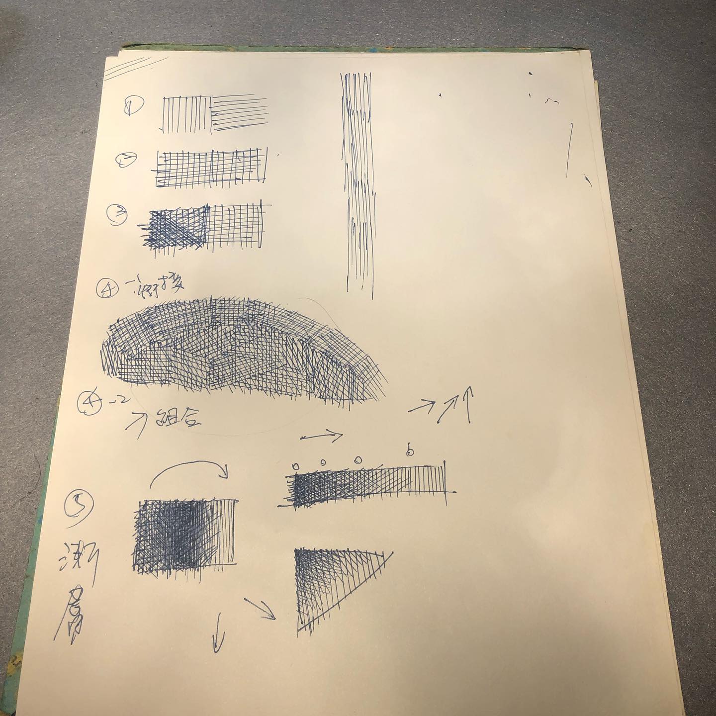延續上次捏陶的素描,這次則是「編織的素描」。老師要我們用學會用線條的方式去建立一個面,不同的線條方向可以編織出的各種密度的面,以「織度」來呈現明暗深淺,建立整體的「調子」。