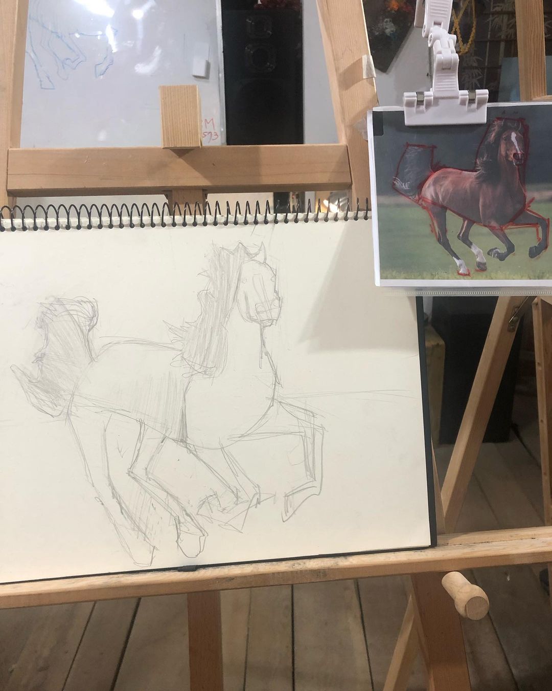 老師提醒,一開始的切線可以越簡單越好,先不要注意細節,而是找到各種不同的大部位,像是把馬肢解一樣,用切線找出牠的軀幹。