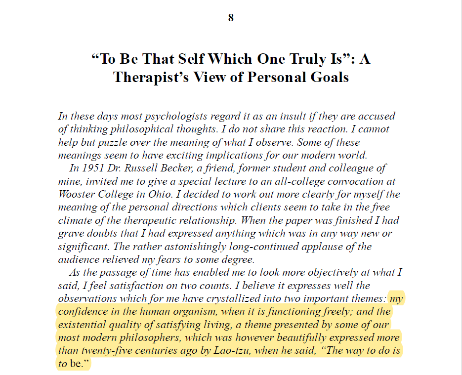 若要將Rogers的哲學思想濃縮為一句話,「成為一個人(On Becoming a Person)」是很棒的縮寫;更提升一個層次的話,我覺得那會是Rogers曾提到的「不為而成(The way to do is to be.)」其原文也就是《道德經》所說: