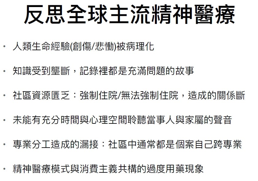 講師提到,在現行的精神醫療中,只要急性發病就會送到醫院治療,可是這種作法的副作用是「人類生命經驗被病理化」。每個人的經驗當中都有不同反應,可是被標籤成一種病理,最常見的是創傷和悲慟反應,例如:古人有喪三年的禮儀,按照現在精神醫療標準可能會被診斷為憂鬱症;女性因為經痛而產生的情緒不穩定被病理化為「經期前症候群」。當人類不同的生命經驗被病理化,我們反而創造出更多的病。