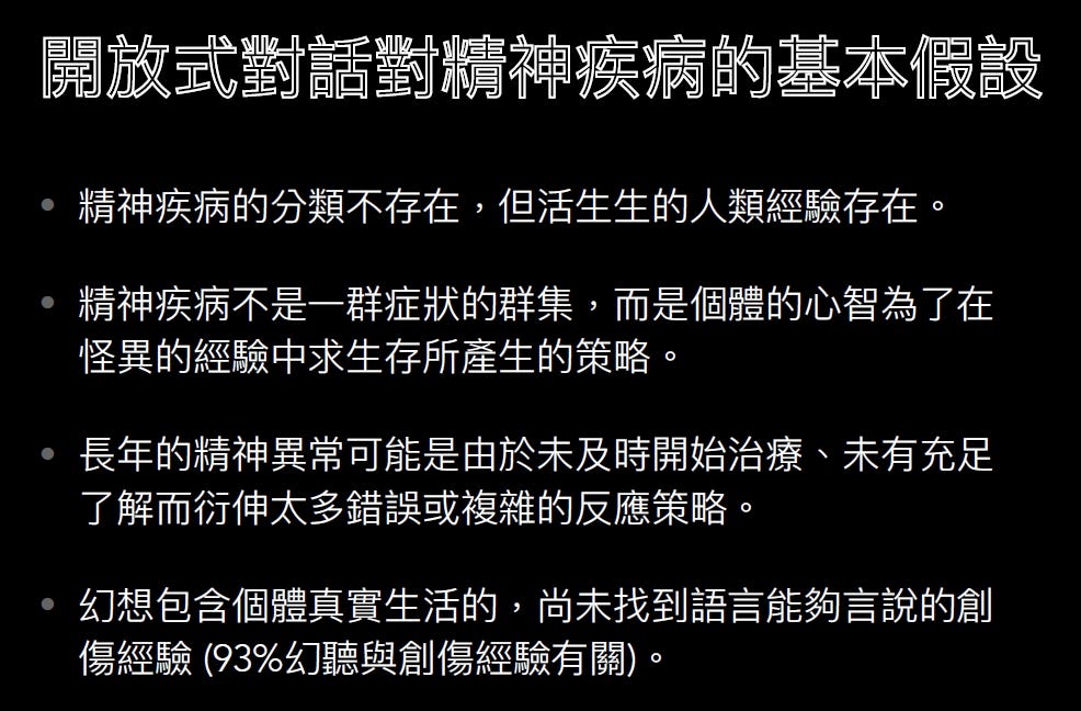 開放式對話將幻聽/幻想視為「當事人尚為找到語言能描述的創傷經驗」,講師提到,美國幻聽者社群Hearing the Voice發現93%的幻聽內容與當事人的創傷經驗是有關係的。